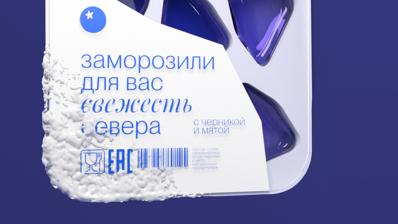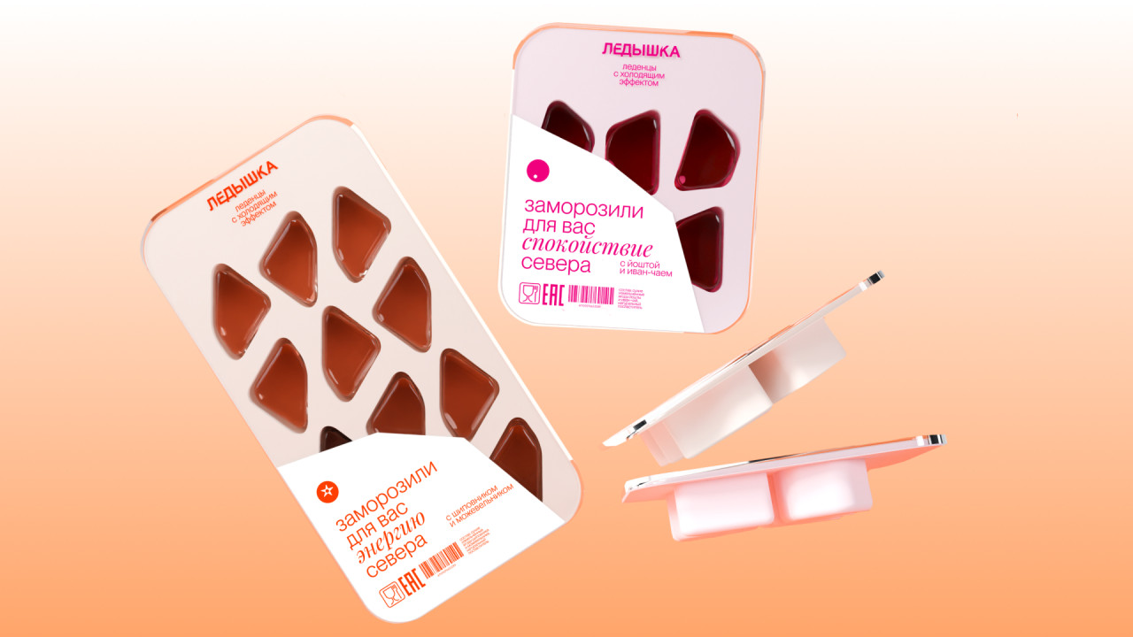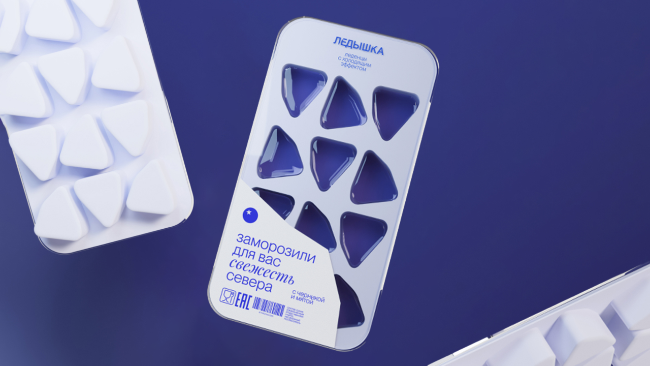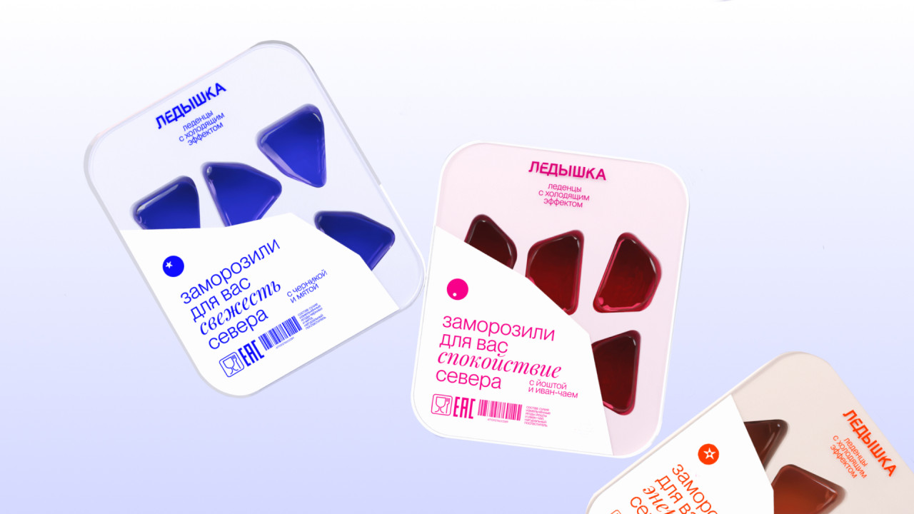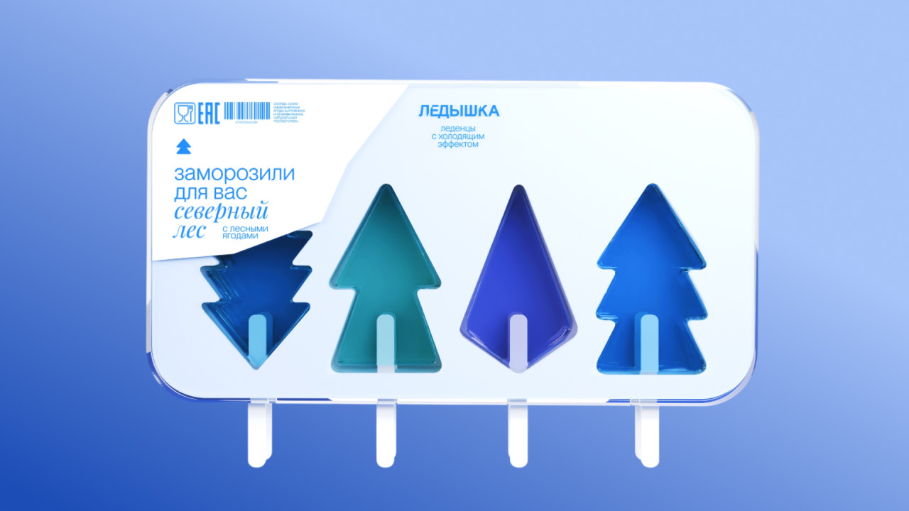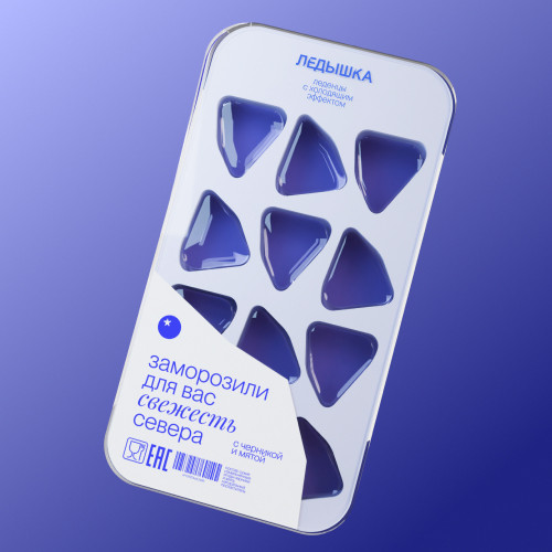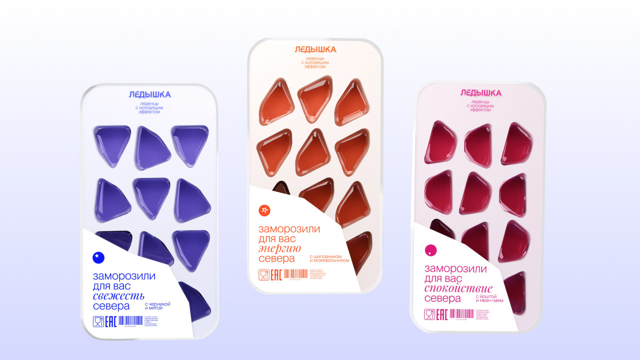 Ледышка — это уникальный бренд леденцов с охлаждающим эффектом, вдохновлённых прохладой северного мороза и созданных из ягод, собранных в лесах Архангельска. Дизайн упаковки был разработан так, чтобы отражать сущность бренда — свежесть и связь с ледяной дикой природой Севера.