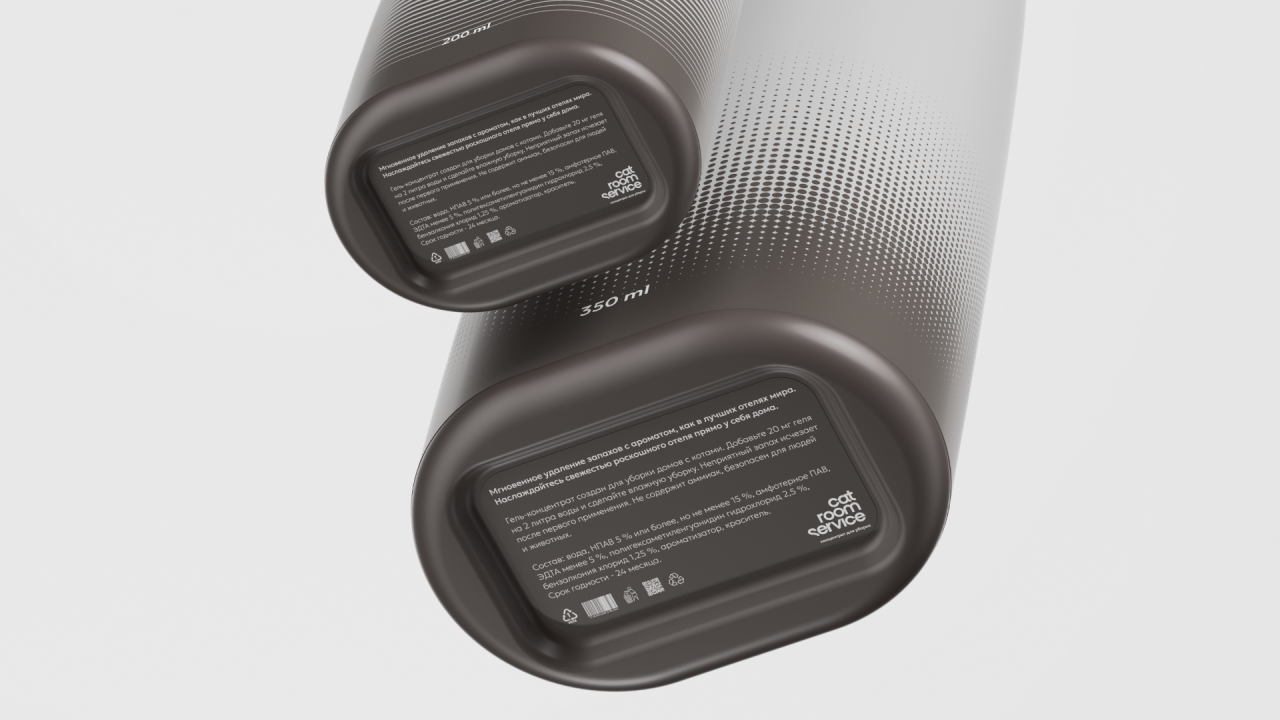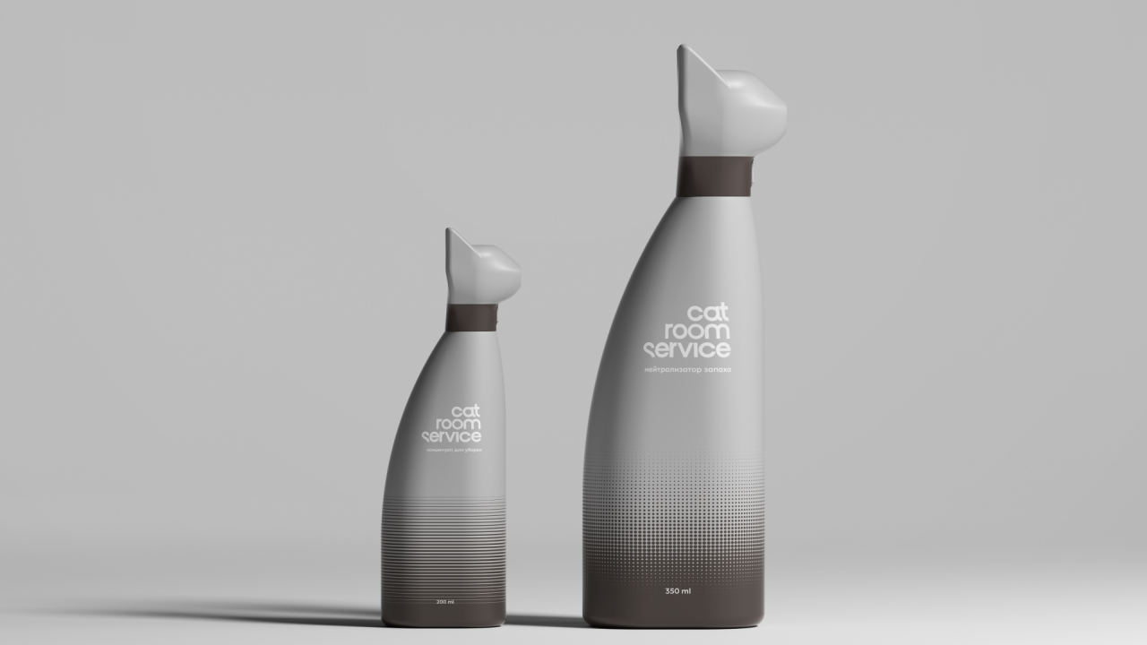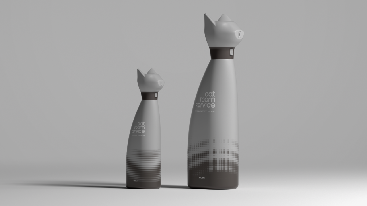 Упаковка создана в рамках учебного кейса в Британке (Cat Room Service). Задача упаковки НЕ создавать визуальный шум в интерьере, при этом быть под рукой, чтобы быстро нейтрализовать неприятный запах, и визульно отделяться от другой косметики и бытовой химии.
