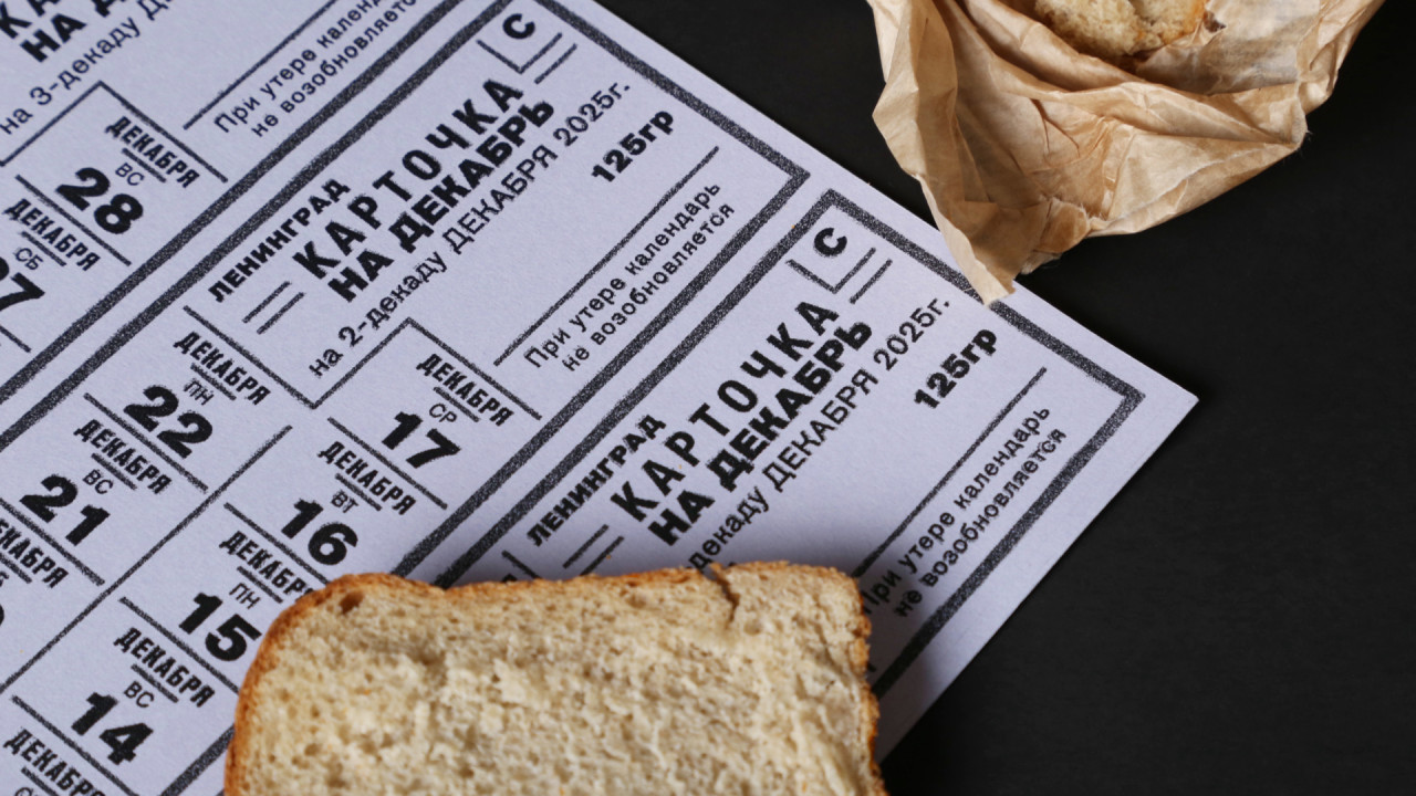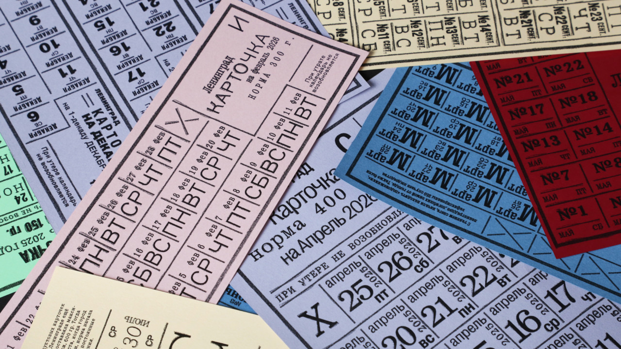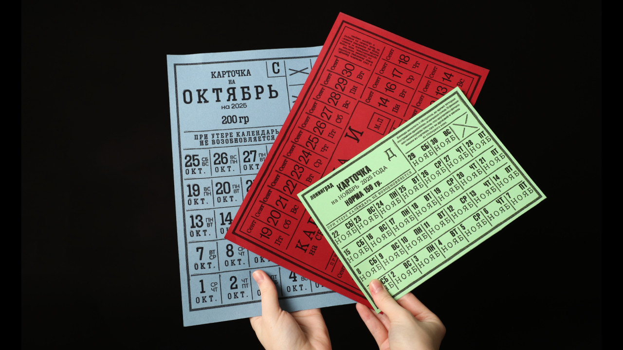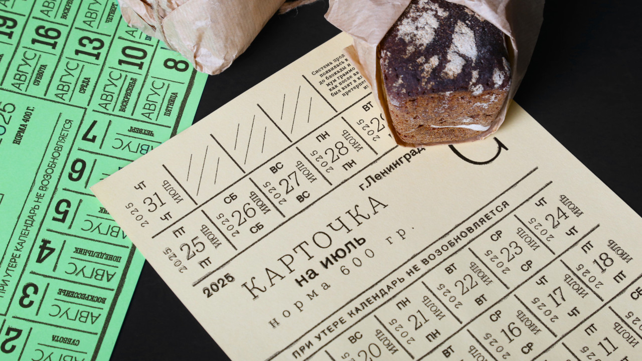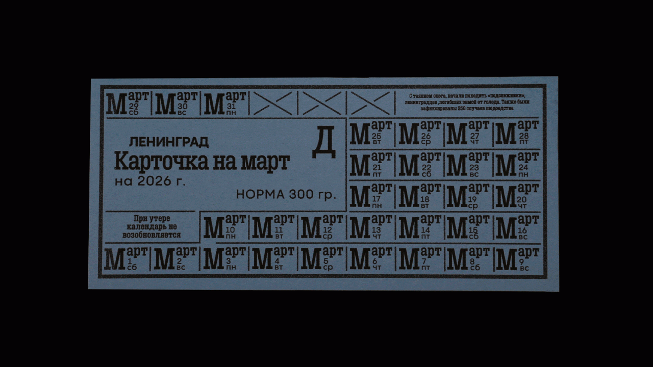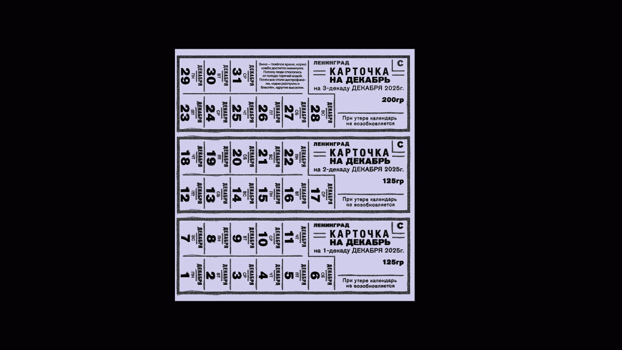 Календарь сделан в честь 80-летия со дня победы в Великой Отечественной войне и посвящён блокаде Ленинграда. Сам календарь выполнен в формате продуктовых карточек, которые были жизненно необходимы человеку, жившему во время блокады. На карточках отмечены изменения в граммовке пайка для иждивенцев и служащих, которые происходили из-за смены времён года и событий, происходящих на фронте и в городе. На некоторых карточках можно увидеть заметки, взятые из дневников блокадников, о том, как они справлялись с происходящим и с какими трудностями им приходилось сталкиваться в тот или иной период. Все карточки разного формата, напечатаны на разной бумаге и имеют индивидуальную вёрстку, вдохновлённую реальными продуктовыми карточками. Сам календарь хранится в плотно зашитом тканевом чехле, поскольку, работая над проектом, я часто находила информацию о том, что карточки берегли как зеницу ока: прятали в самых укромных местах, также зачастую ленинградцы вшивали их в одежду или заматывали в ткань.