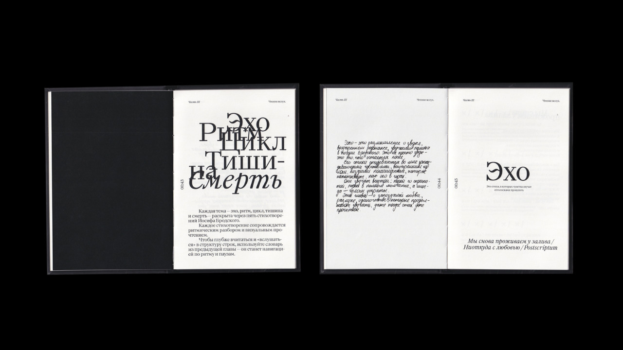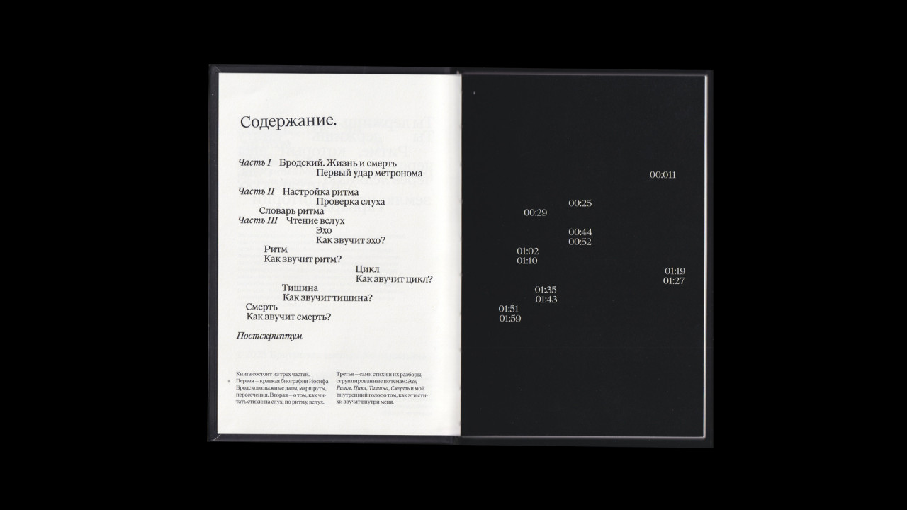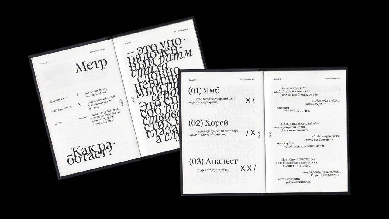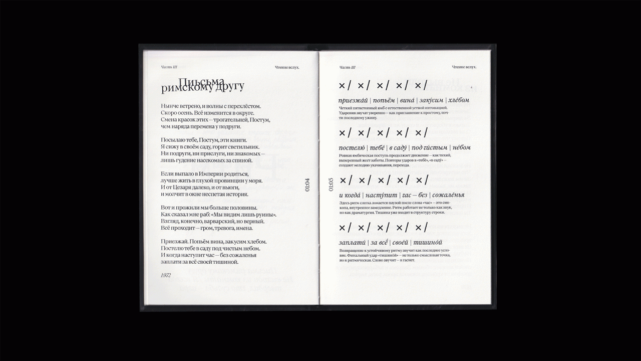 На страницах соседствуют тексты Бродского, схемы ритмов с делением строк по стопам и субъективные описания того, как эти строки звучат и переживаются мной. Книга работает на границе литературы и дизайна: метр и ударения превращаются в визуальные знаки, а читатель видит ритм глазами, словно партитуру для внутреннего слуха.