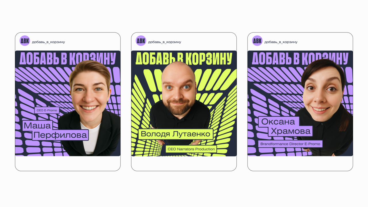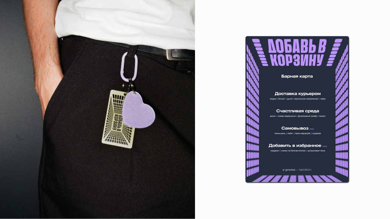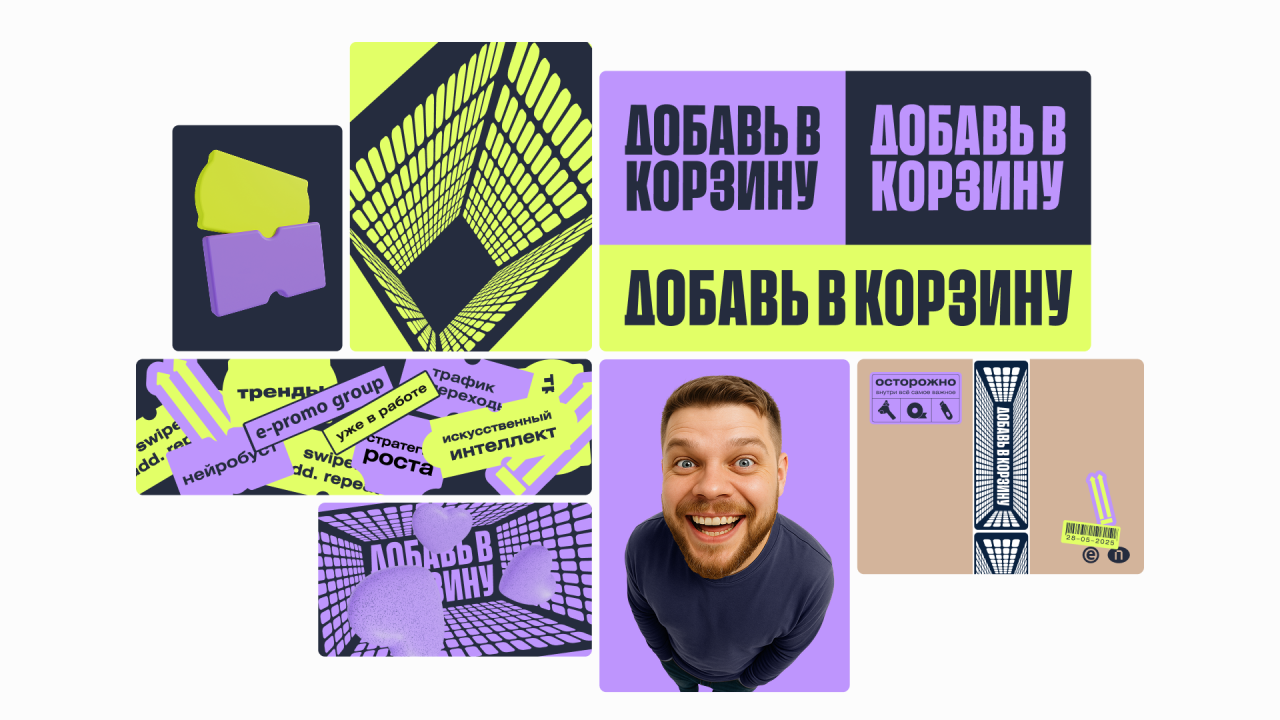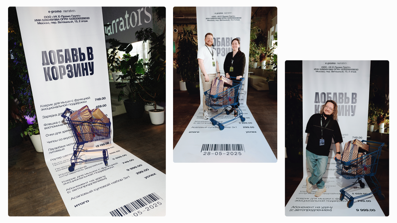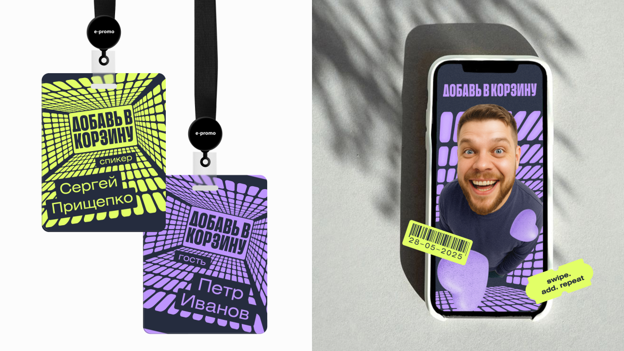 Сделали мероприятие с четким фокусом на маркетплейсы. Начали с нейминга, бодро продолжили айдентикой и закончили авоськами с фирменным мерчом. В основе концепта — корзина, символ онлайн-шопинга и визуальное подкрепление нейминга. Заглянули внутрь корзины — появился эффект погружения в тему. Добавили ценники-плашки, иконки «лайков» и «избранного» — всё, что мы видим на маркетплейсах. А фото спикеров сделали нейросетями с эффектом фишай и манящим взглядом изнутри корзины.