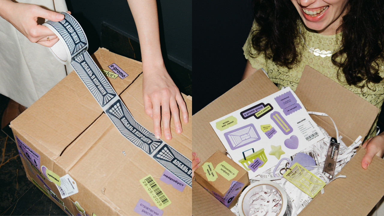 В подарках продолжили вайб проекта: авоська с брендированной коробкой, оклеенной фирменным скотчем и стикерами. Внутри — набор «гейм-ченджер» для работы с маркетплейсами: - диспенсер для скотча - брендированный канцелярский нож - брелоки - стикерпак