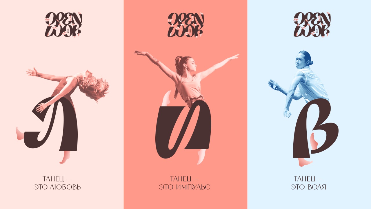 Современный танец — это глубокие истории. Главный инструмент танцора — его тело. Главный инструмент рассказчика — слова. Так родилась метафора "язык тела", которая помогла нам найти связь между строением букв и движениями танцоров. В основу стиля лег фирменный алфавит, где мы наделили буквы пластикой танцующих. Уже с самого начала стиля логотип встречает нас как ансамбль, выполненный плотно сбитыми словами Open Look. Так мы транслируем главную ценность фестиваля — связь между людьми. И далее стиль начинает оживать, т.к. теперь буквы наделены способностью танцевать. Они выстраиваются в группы, хаотично пляшут, солируют и образуют необычные композиции. Танцевальный фестиваль, где истории выходят на передний план сцены. Благодаря внедрению букв айдентика позволяет точно доносить эмоциональные сообщения, а превращение их в танцоров делает стиль ярким и живым.