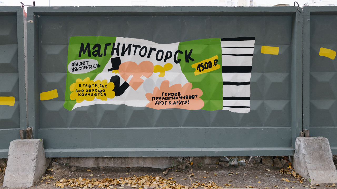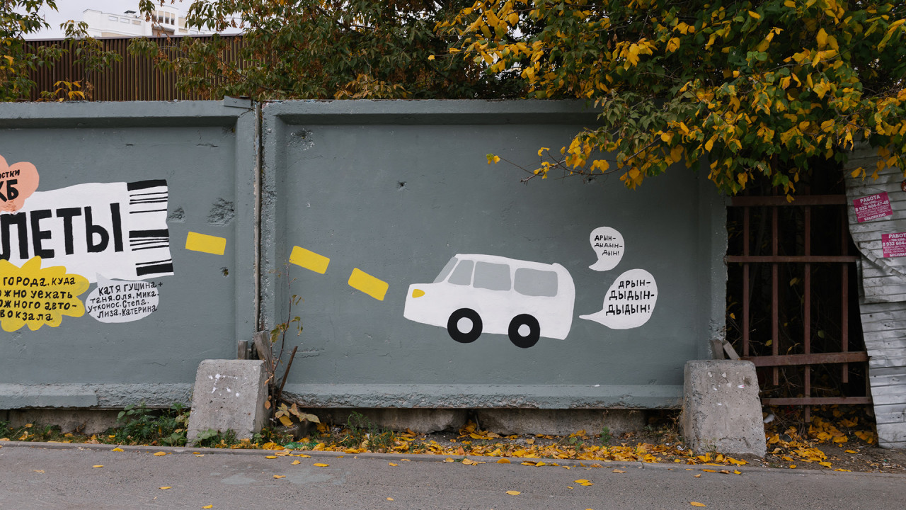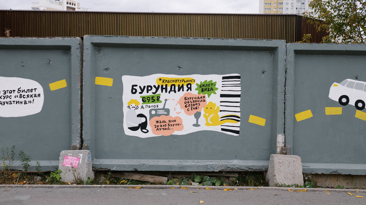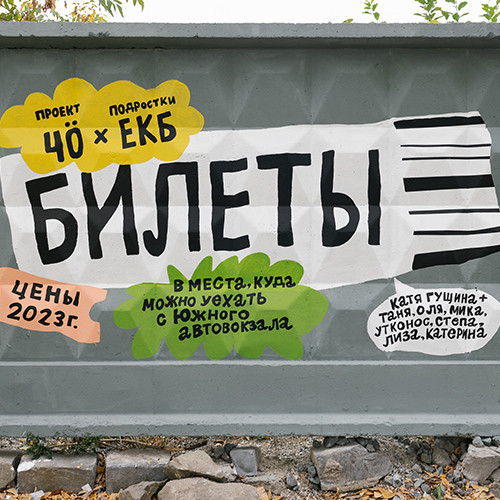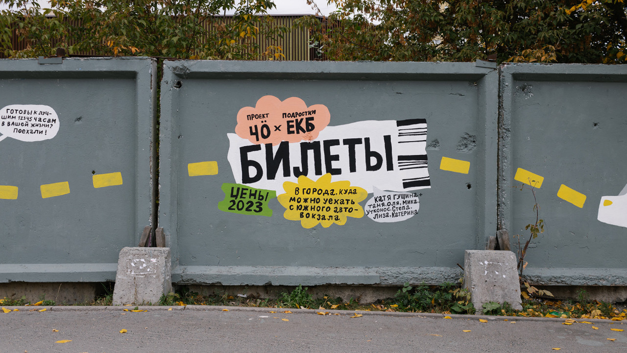«Билеты» в малые города и села Свердловской области появились на заборе рядом с Южным автовокзалом от паблик-арт-программы «ЧО» при поддержке уральского холдинга «Атом». Художница Катя Гущина вместе с подростками Екатеринбурга собрала локальные сюжеты и захватывающие истории, а горожане помогали расписать огромный бетонный забор.